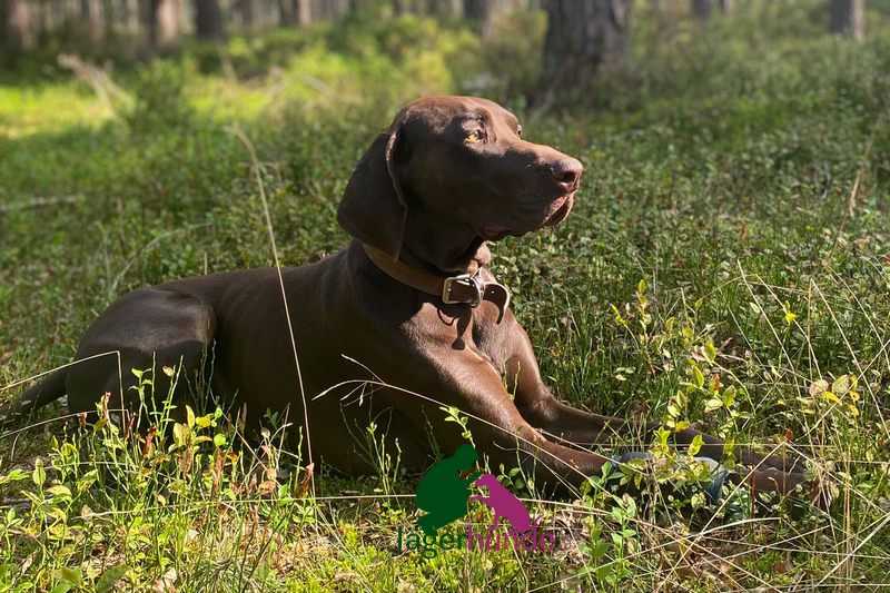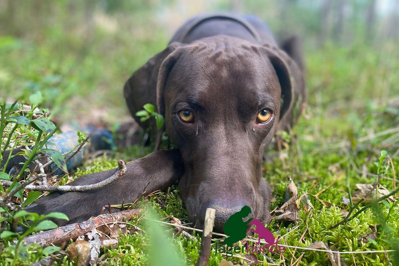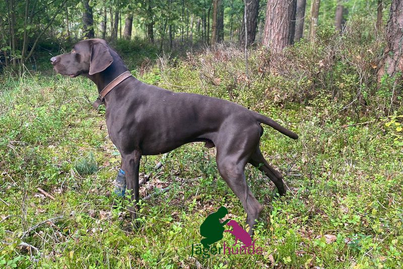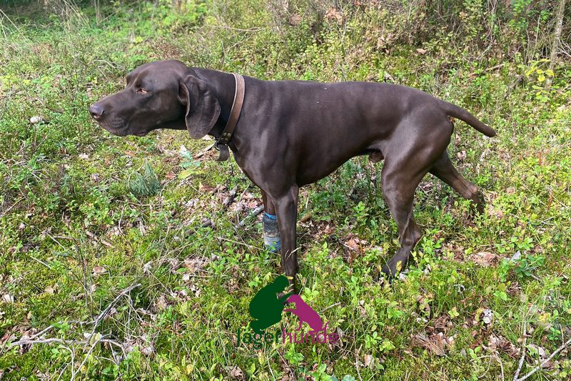 Deutsch-Kurzhaar Rüde aus jagdlicher Leistungszucht mit sehr guten jagdlichen Veranlagungen. Er zeigt eine grundsätzlich gute Arbeitsmotivation und Lernbereitschaft.,