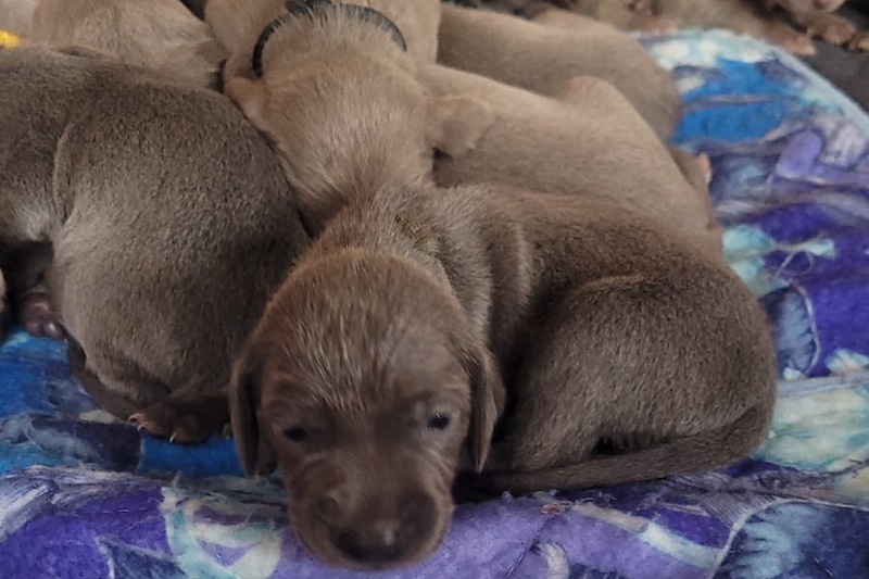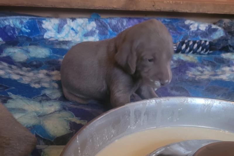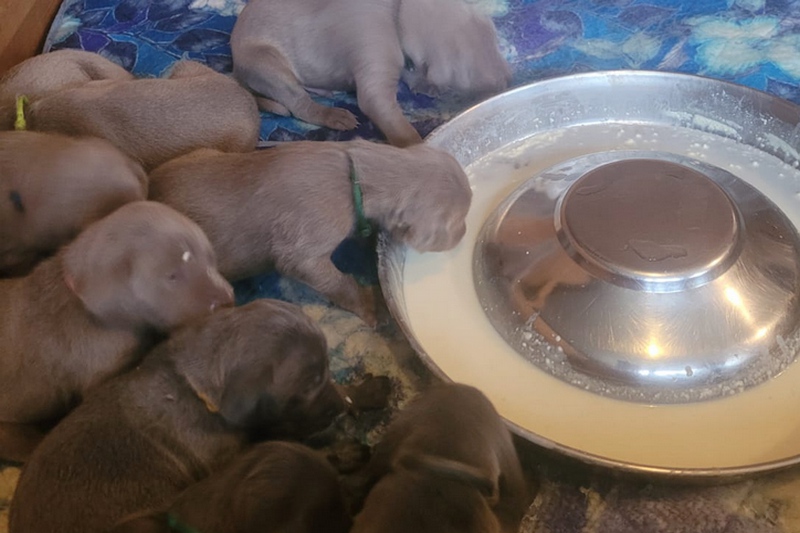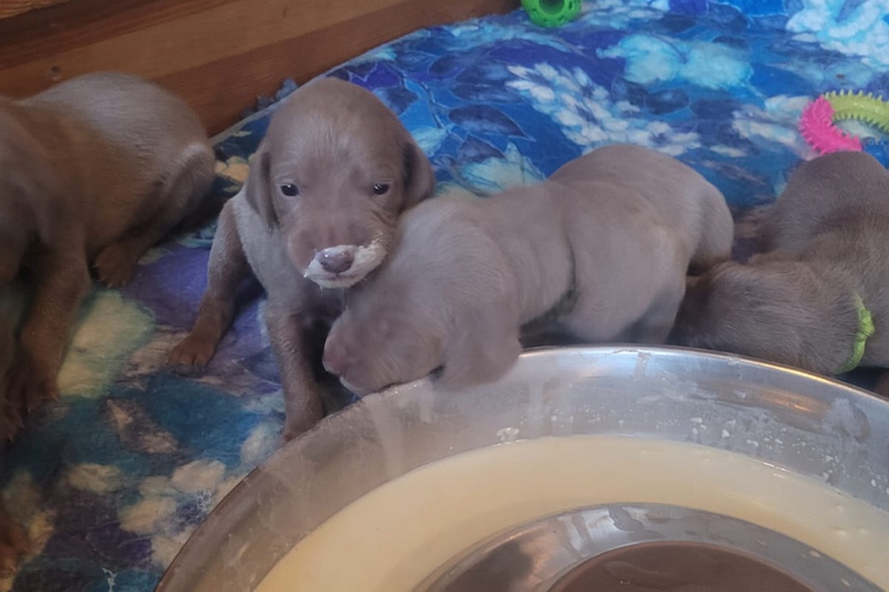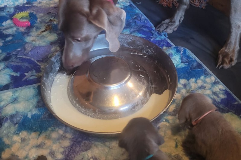 Jetzt bringt der Room Service sogar das erste zusätzliche Menü, leckere Welpenmilch wird zugefüttert, um Jule zu unterstützen! Die graue Rasselbande ist begeistert und hat schnell gelernt ein Mäulchen voll vom Milchbrei nehmen!