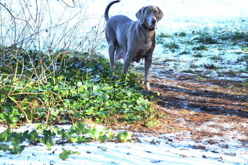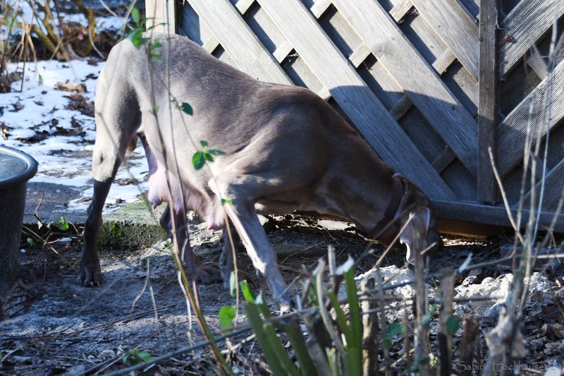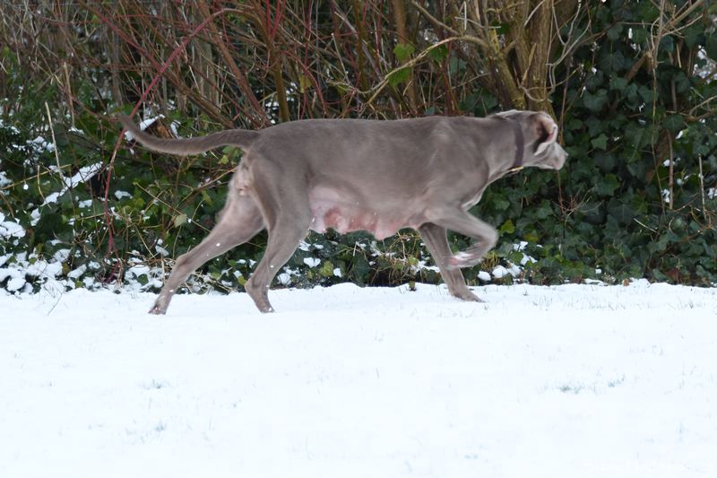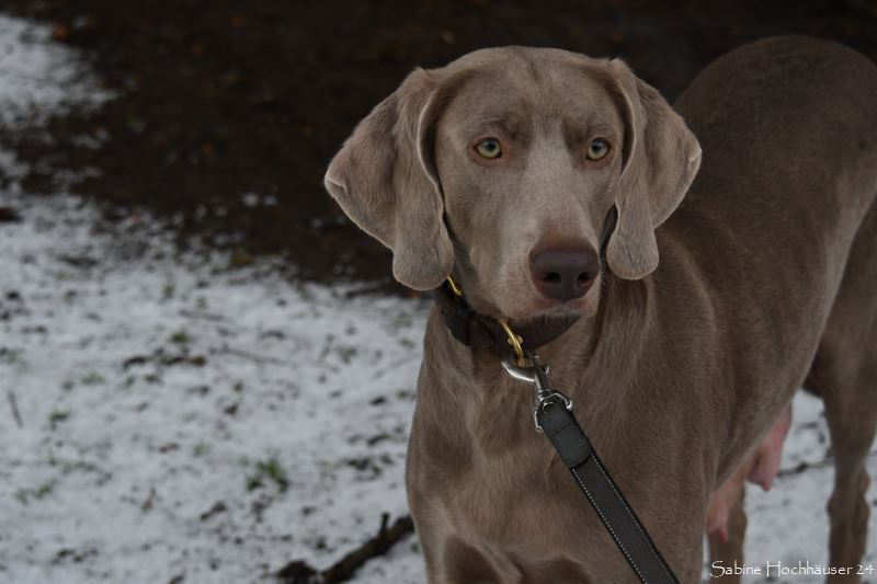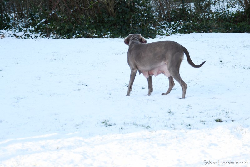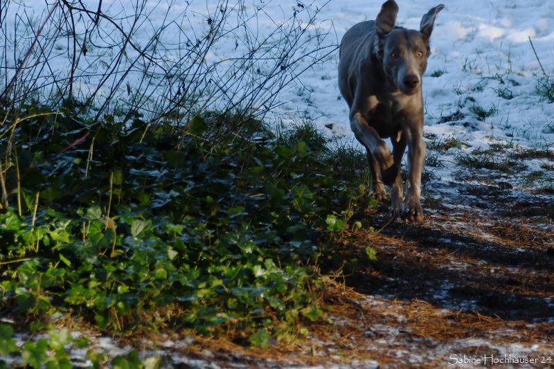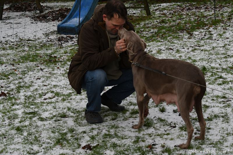 Die Hündin war flott stubenrein und zeigt sogar an, wenn sie raus möchte. Ihre anfängliche Unsicherheit Draußen, schlug schnell in Neugier um. Bei dem Schnee lief sie erst wie auf rohen Eiern, was man sonst nur von Welpen beim ersten Frost kennt. Kurzum Jule erlebte also Schnee zum ersten Mal an ihren Pfoten. Zu goldig, wie sie nun im Schnee herumtobt. Selbst mit ihrem Nachwuchs oder mit uns Zweibeinern. Es ist eine Wonne zu erleben, wie die Silber-Lady aufblüht. Autofahren, Pfoten abputzen, Leine laufen und sogar mit Spielzeug spielen – alles null Problem. Auch Geschmack hat Jule! Denn Vorsicht – gefällt ihr ein Kissen nicht, zögert sie nicht es in eine Schneelandschaft zu verwandeln. Selbst an Silvester war sie die Ruhe selbst.